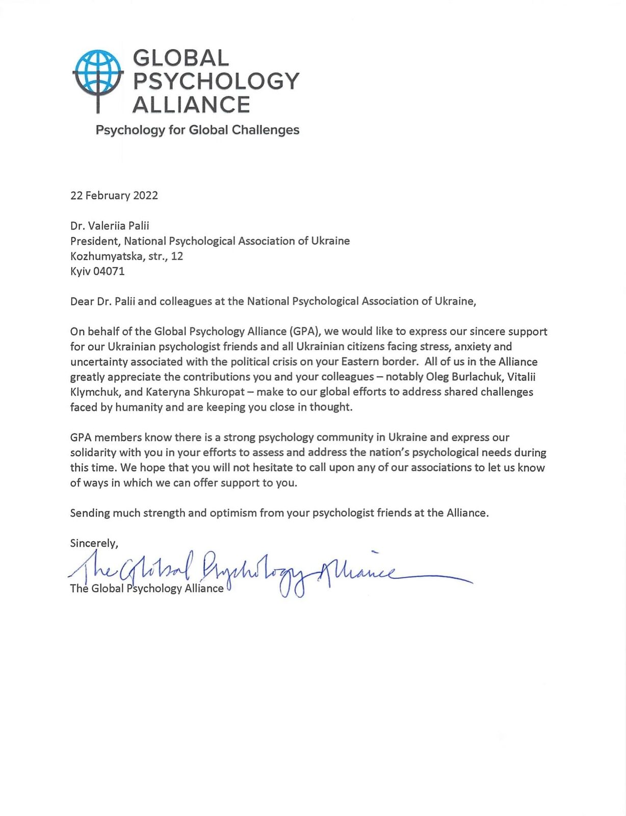 Від імені Глобального психологічного альянсу ми б хотіли висловити нашу щиру підтримку нашим колегам в Україні та українським громадянам які зараз переживають стрес, тривогу та невизначеність, пов’язану з політичною кризою на ваших Східних кордонах. Члени Альянсу дуже цінують ваш внесок та ваших колег, особливо Олега Бурлачука, Віталія Климчука та Катерини Шкуропат та ваші зусилля у вирішенні глобальних викликів людства та думають про вас у ці дні.